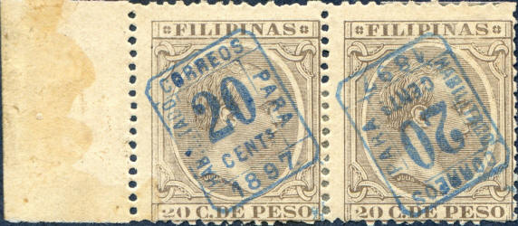 Bartels et al (1904) indicate that this issue comprises a blue surcharge on the 1893 20c brown stamp. This description is repeated by Palmer (1912) and Galvez (1942) similarly reports that the surcharge occurs on the second printing. Therefore, the base stamp would be expected to comprise examples with the repaired and generally intact oval frame and have gum type B.