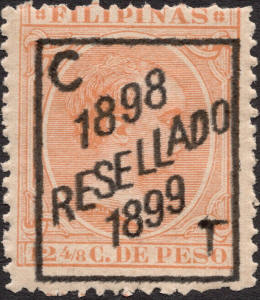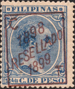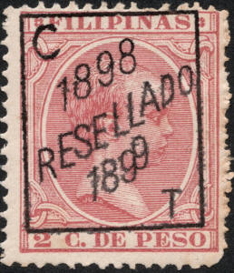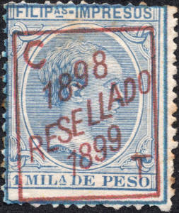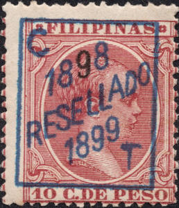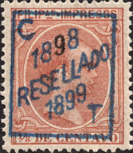 Overprinted handstamps with '1898 RESELLADO 1898.' Genuine overprints were applied to the 1899 “Curly Head” Alfonso XIII stamps but it was not used on the 1890-1897 issues.