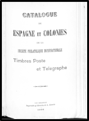 Joaquin Minondo had earlier published ’Catálogo de los Sellos de España 1850 a 1901’ in 1901 with second and third editions in 1903 and 1905. However, in 1906 he published in San Sebastion a new version which included the Spanish Colonies. The catalogue was in French but with an introduction in Spanish and sold for a price of 1 Franc. A second edition was issued in 1911.